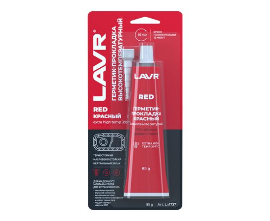 Герметик LAVR полимеризуется за 15 минут и полностью вулканизируется через 18 – 24 часа. Он подходит для ремонта тяжелонагруженных примыкающих узлов и соединений трансмиссий и двигателей, в том числе оснащенных турбонаддувом. Герметик-прокладка красный от LAVR
