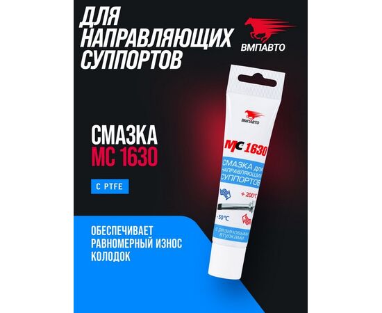 Преимущество Работает даже при 10 кратном загрязнении цементом направляющих. Не коксуется даже при десятикратном добавлении цемента за счет PTFE в составе. Подходит для направляющих в том числе с резиновыми втулками. Описание Отлично подходит для смазывания направляющих суппорта, в том числе с резиновыми втулками. Защищает от залипания, закоксовывания и присыхания направляющих, обеспечивая равномерный износ колодок и безопасное торможение. Не оказывает воздействия на резиновые втулки направляющих, продлевая срок их службы. Диапазон температур от -50?С до +230?С Применение 1) Нанести тонким слоем (0.1 мм) на чистую поверхность направляющих 2) Установить направляющие в суппорт