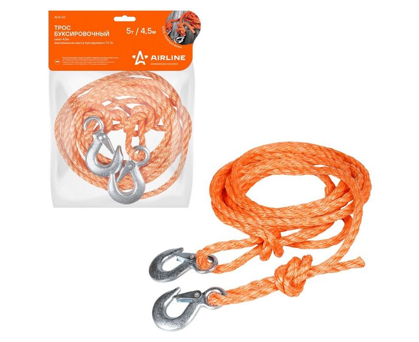 Трос буксировочный, имеющий форму каната, оснащен грузоподъемностью в 5 тонн и длиной 4,5 метра. Состав каната является гарантией долгого функционирования изделия. В состав входит полипропиленовая нить, отличающаяся особой прочностью и неподверженности резким перепадам температур. Для фиксации автомобилей предусмотрены металлические крепления.