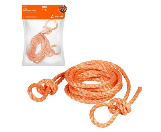 Буксировочный трос в виде каната от AIRLINE произведен с учетом эксплуатационных условий изделия. В состав входят нити повышенной прочности из полипропиленового волокна. Грузоподъемность каната равна 7-ми тоннам – этого достаточно для работы с мало и среднегабаритными автомобилями. Длина троса составляет 5 метров.