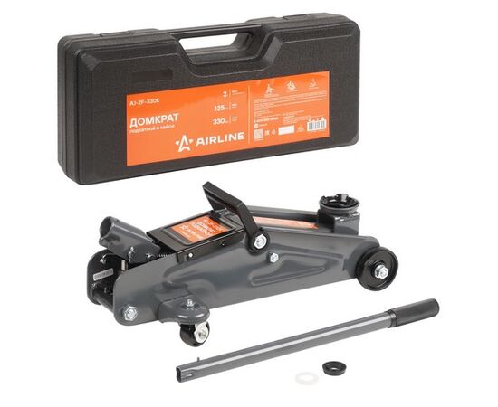 Домкрат изготовлен производителем AIRLINE по классической конструкции. Для более легкого и безопасного подъема груза корпус домкрата оснащен усовершенствованным строением и механизмом. Максимальный порог грузоподъемности, производимый домкратом, составляет 2 тонны. Для безопасной и удобной транспортировки домкрата предусмотрен кейс из прочного пластика. Гарантия — 1 год.