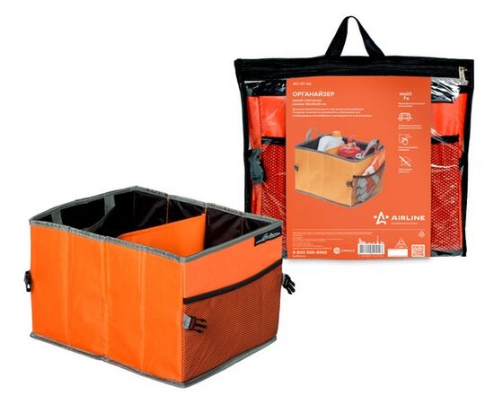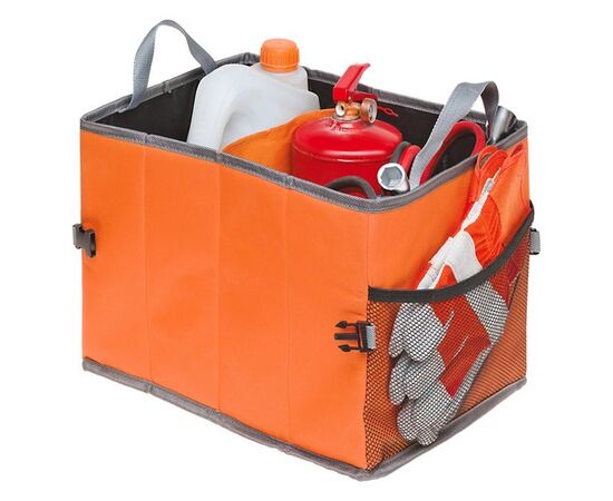 Благодаря своей конструкции имеет большой объем, два отсека и наружный карман, позволяющие разместить в нем все необходимые автомобилисту инструменты и аксессуары. Имеет удобные ручки для транспортировки. Компактный органайзер для багажника не займет много места в салоне автомобиля. Несмотря на небольшие размеры, органайзер является весьма вместительным и позволяет перевозить большое количество вещей. Для организации пространства изделие разделено на два отдела, а также оснащено карманом на внешней стороне сумки. Особая структура крепления на нижней наружной части органайзера препятствует скольжению сумки по салону автомобиля.