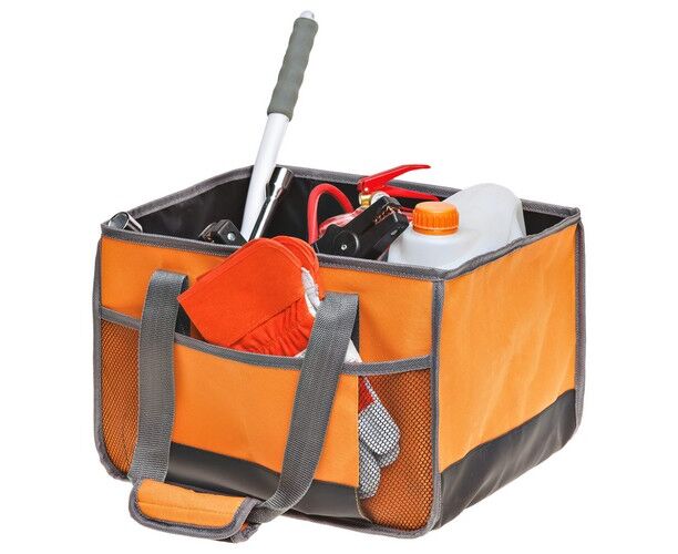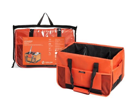 Благодаря удобным ручкам этот органайзер можно использовать в качестве сумки для покупок. Для предотвращения скольжения по багажнику на дне органайзера предусмотрено противоскользящее покрытие. Параметры автомобильного органайзера 40х30х28 см – это оптимальный вариант для среднегабаритного багажного отделения машины. Изделие изготовлено из полиэстера оранжевого цвета с серыми вставками по периметру сумки. Органайзер оснащен тремя раздельными карманами внутри изделия. На внешней части изделия также расположено три кармана для хранения необходимых мелочей.