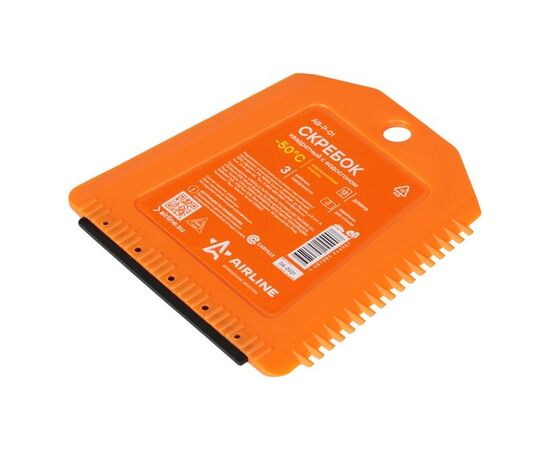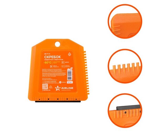 Скребок представляет собой изделие квадратной формы оранжевого цвета. На боковой и нижней части изделия расположены рабочие поверхности. Ребристая поверхность скребка позволяет удалить загрязнения или лед в сложно доступных местах, а водосгон устраняет разводы с корпуса автомобиля.