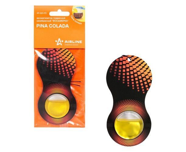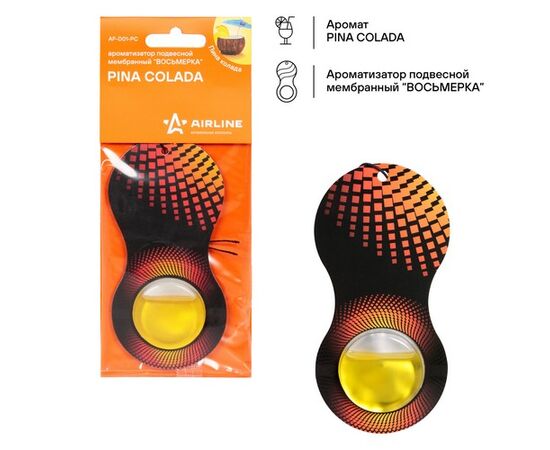 Модель из серии ароматизаторов «Восьмерка» от AIRLINE имеет необычную форму, яркую расцветку, а также подвесную систему крепления. Гелевая основа ароматизатора расположена в пластиковом круглом блистере в нижней части изделия. Запах ароматизатора Пина Колада сочетает в себе сладость тропических фруктов.