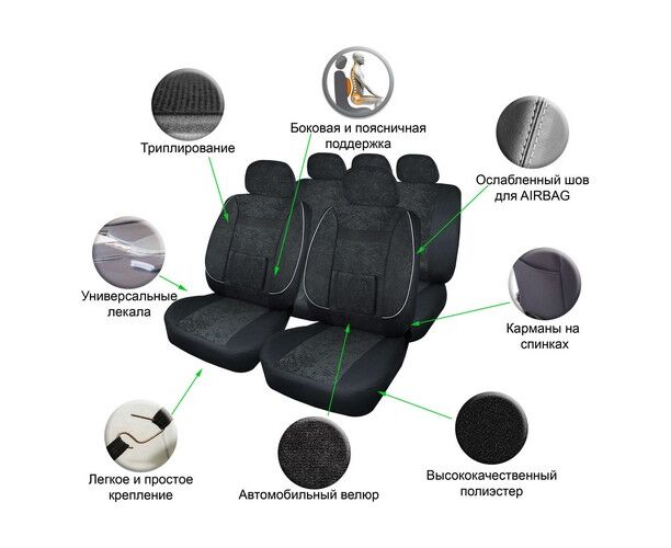 Чехлы для сидений универсальные "MONRO", 11 пред., повыш. комфорт, велюр, черн. (ACS-UV-01)