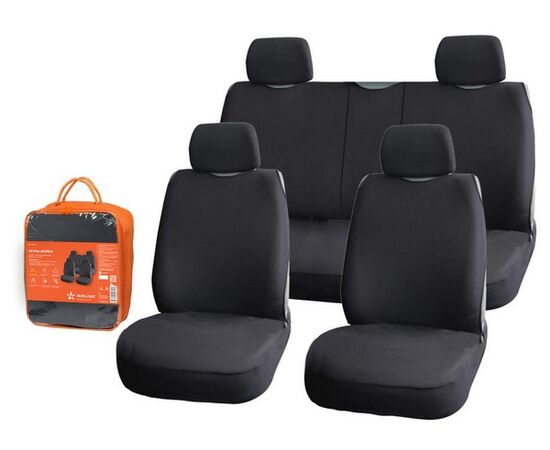 1. Чехол-майка на переднее сидение – 2шт. 2. Чехол на заднее сидение – 1 шт. 3. Чехол на подголовник – 4 шт. 4. Набор крепежей для установки – 1 к-т. 5. Сумка с цветным вкладышем – 1 шт.