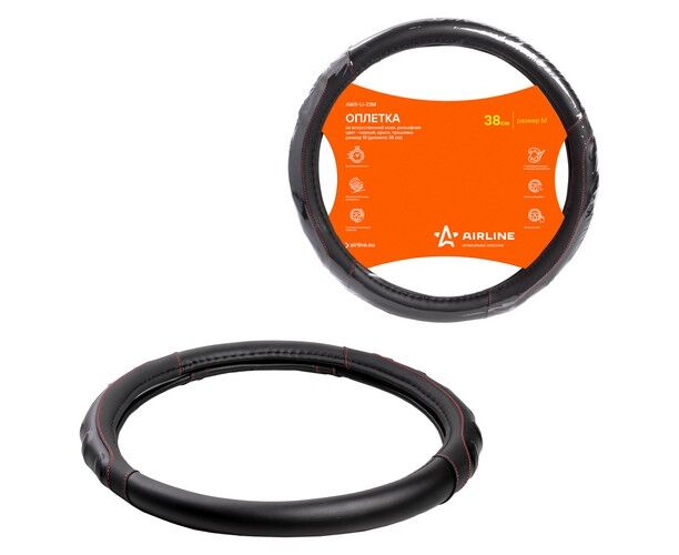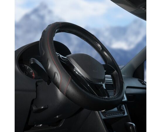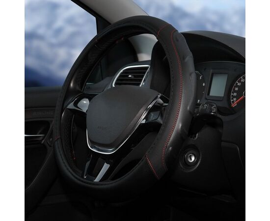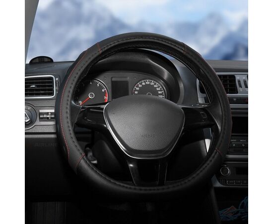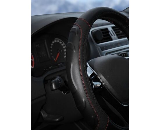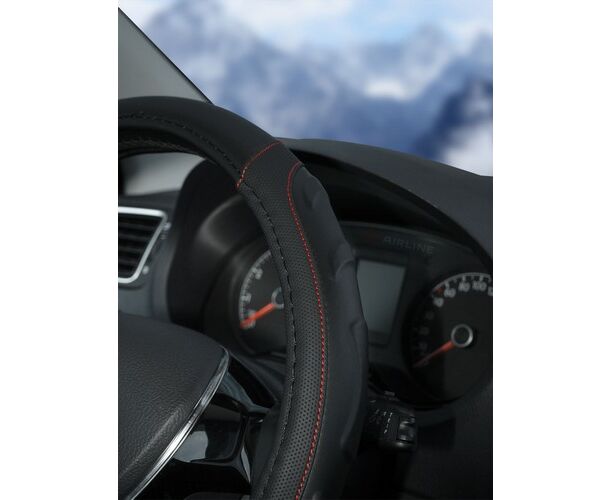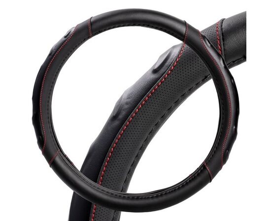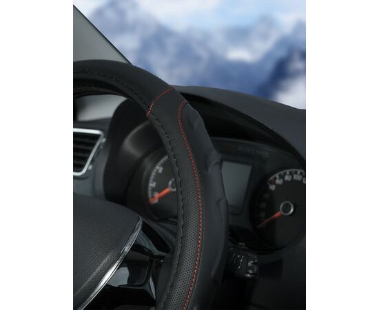 Оплетка на руль, искусст. кожа, рельефная, черная, красн. прошивка, 38 см/М (AWS-LI-22M)