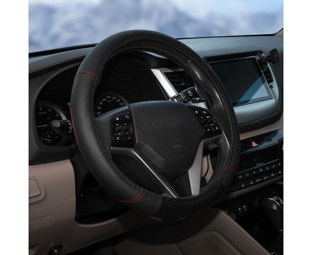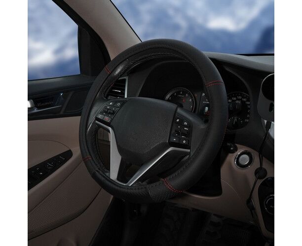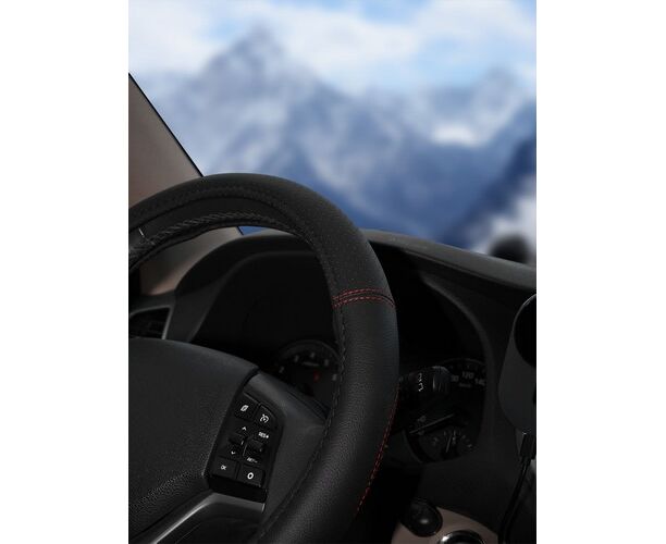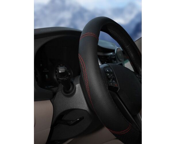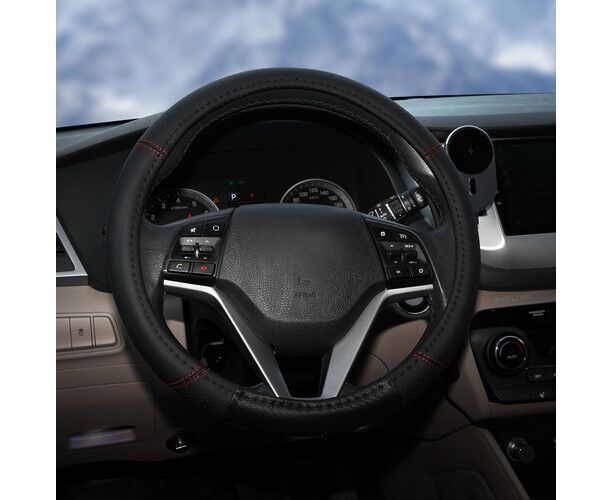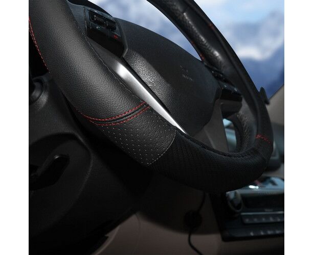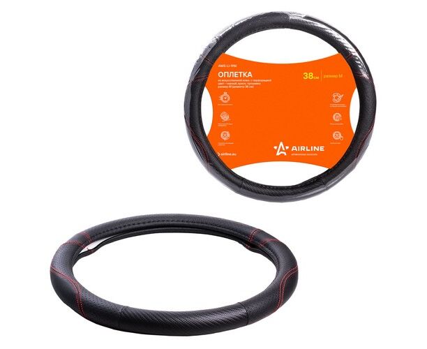 Оплетка на руль, искусст. кожа с перф., черная, красн. прошивка, 38 см/М (AWS-LI-19M)