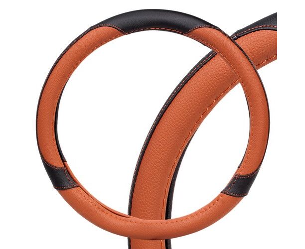 Оплетка из искусственной кожи – это оригинальный аксессуар для автомобиля, а также надежная защита покрытия руля от потери цвета и появления дефектов различного плана. Основной цвет изделия – коричневый. По бокам и на нижней части оплетки имеются вставки черного цвета. Размер изделия L, а диаметр 40 см.