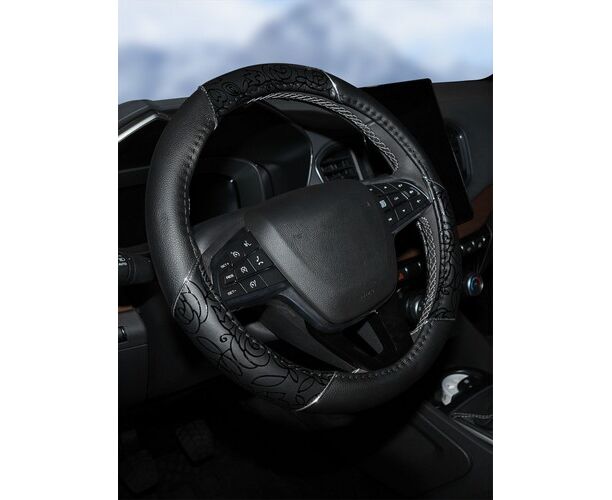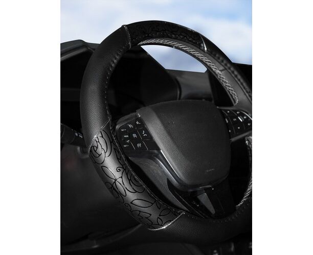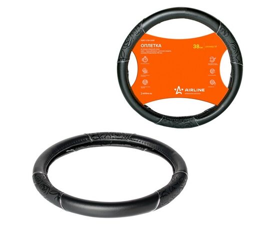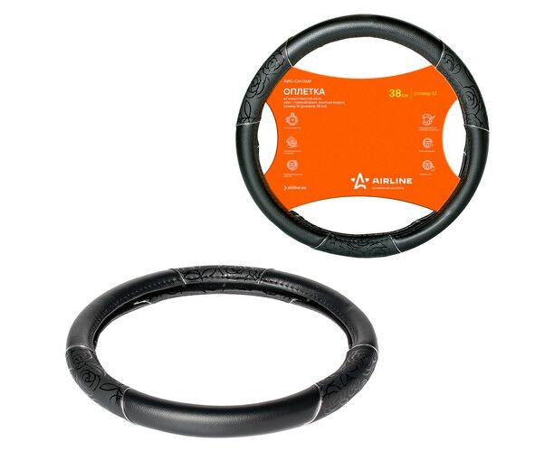 Модель оплетки для руля автомобиля разработана дизайнерами AIRLINE специально для женщин. Она имеет черный цвет, диаметр 40 см, а также стильные лаковые вставки с оригинальным принтом. Оплетка способствует увеличению комфорта при управлении транспортным средством, а также играет роль стильного автомобильного аксессуара.