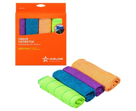 В набор изделий для уборки от AIRLINE входят 4 салфетки различных цветов, упакованные в прозрачную блистерную упаковку прямоугольной формы. Салфетки состоят из микрофибры, которая отличается повышенными влаговпитывающими показателями. Особая поверхность салфеток способна не только устранить загрязнения с плоскости, но и отполировать поверхность изделия.