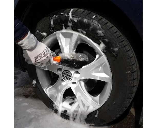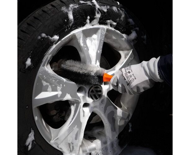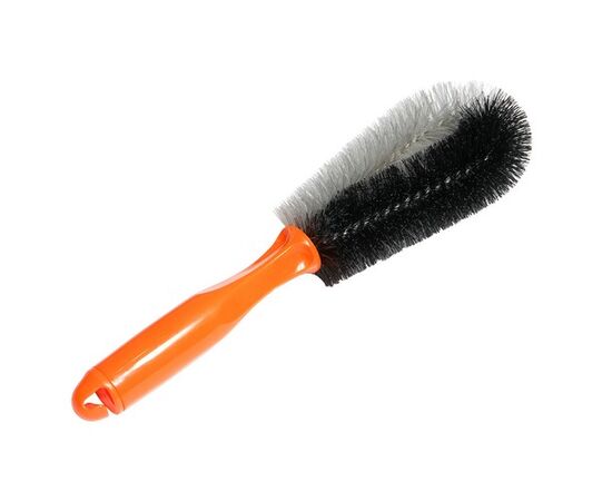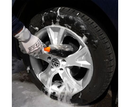 Компактная щетка-ершик позволит избавиться от проблемных загрязнений на корпусе автомобиля. Щетка имеет густую жесткую щетину кольцеобразной формы. Ручка щетки изготовлена из пластика оранжевого цвета.