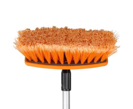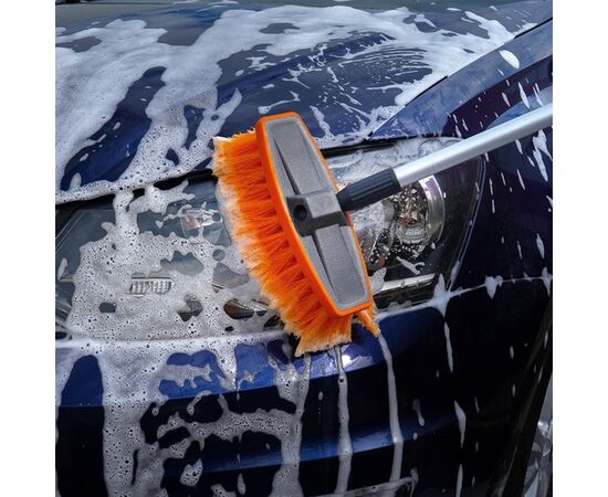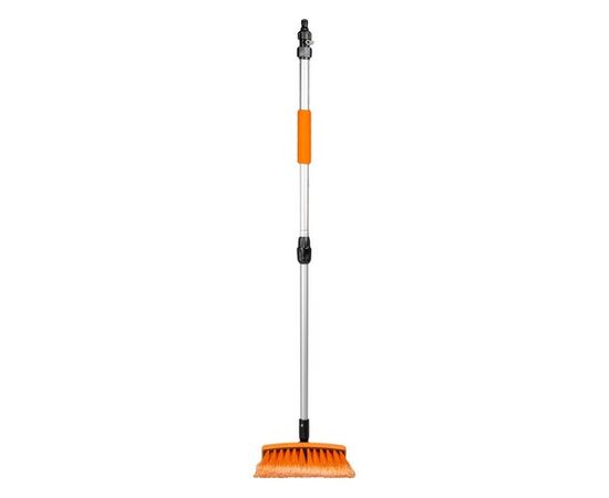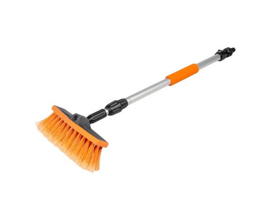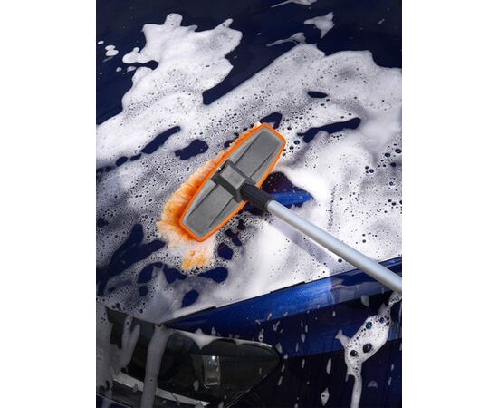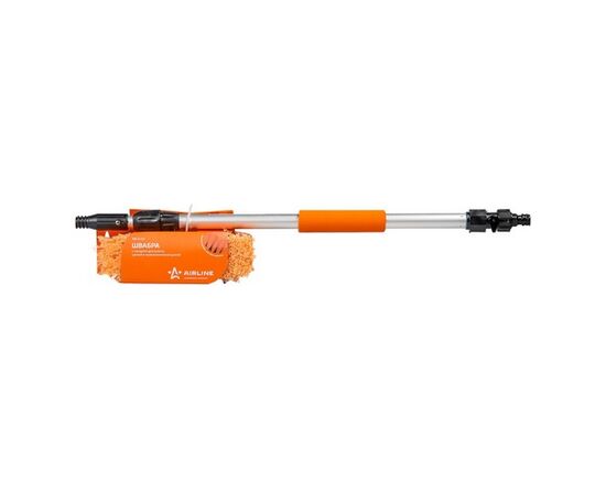 Швабра со складывающейся ручкой и насадкой для шланга поможет тщательно и быстро очистить автомобиль от загрязнений. Длина ручки составляет 100 см в разложенном виде и 65 см в сложенном состоянии. Рабочая поверхность швабры оснащена щеткой длиной 20 см с мягким густым ворсом оранжевого цвета. Также швабра имеет насадку, предназначенную для присоединения моющего шланга.