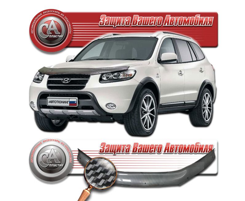 Дефлектор капота Hyundai Santa Fe II поколение, джип/suv 5 дв., рынок России (Шелкография "карбон" серебро)