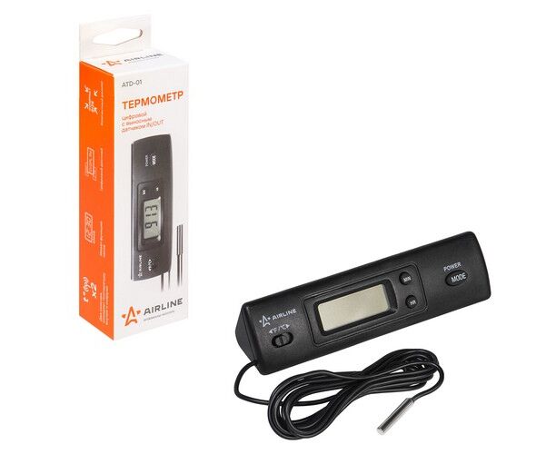 Современное устройство от AIRLINE дает возможность определить температуру окружающей среды с помощью компактного термометра, который отличается безопасной комплектацией, а также простой схемой использования. Фиксация температуры производится за счет выносного датчика, который отображает полученные результаты на компактном дисплее, размещенном на корпусе устройства.