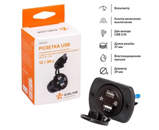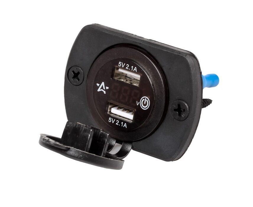 Розетка USB встраиваемая влагозащ. с 2 портами и вольтметром (вкл/выкл) (5В, 2.1А + 2.1А) (AEBJ203)