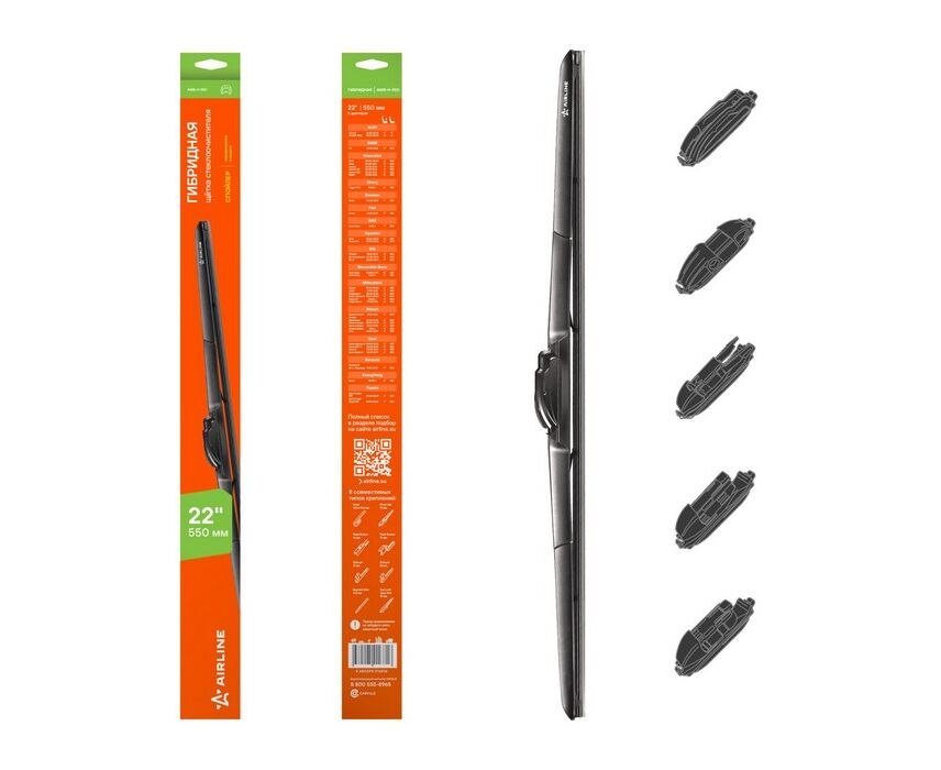 Модельный ряд представлен в широком диапазоне размеров от 14 (360 мм) до 28 (700 мм). Для щеток были специально разработаны 8 различных адаптеров, с помощью которых становится возможным использовать щетки в подавляющем большинстве существующих креплений и соответственно сделать подходящими на 99% автомобилей. Разработчики AIRLINE создали конструкцию щеток, которая гарантирует бесшумную работу изделия, а также максимальный срок его эксплуатации. В состав поверхности щеток входит искусственная резина. Она изготовлена с применением озона, который препятствует старению и износу поверхности щетки. Размер изделия составляет 550 мм. AWB-H-550