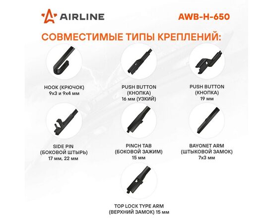 Модельный ряд представлен в широком диапазоне размеров от 14 (360 мм) до 28 (700 мм). Для щеток были специально разработаны 8 различных адаптеров, с помощью которых становится возможным использовать щетки в подавляющем большинстве существующих креплений и соответственно сделать подходящими на 99% автомобилей. Разработчики компании AIRLINE усовершенствовали конструкцию щеток стеклоочистителя и сохранили доступную стоимость изделия. Графитовое покрытие резины является гарантом безопасной работы щеток, а также именно покрытие значительно снижает шум во время эксплуатации изделия. Размер щеток стеклоочистителя данной модели составляет 650 мм. Конструкция гибридная. AWB-H-650