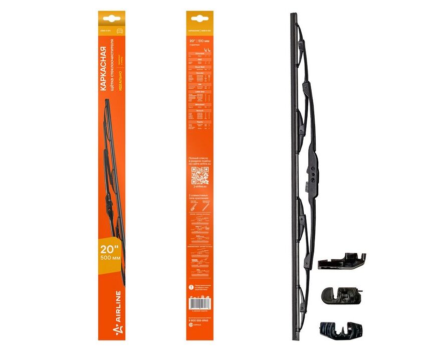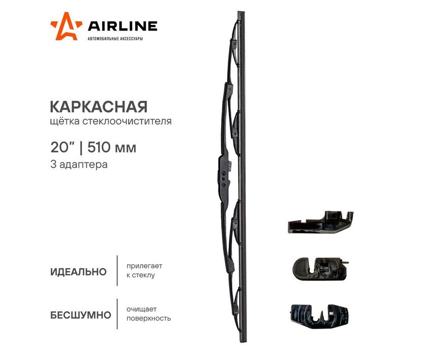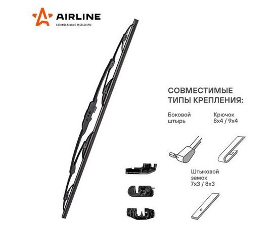 Каркасная конструкция щетки стеклоочистителя — это качество, проверенное десятилетиями. Такие щетки являются самыми доступными по цене, обладает высокой прочностью, и лучшими показателями прилегания резинок к стеклу автомобиля. К классической форме щетки производители AIRLINE добавили изменения в составе резины, позволяющие продлить ее срок использования. В комплект добавленны адаптеры подходящие для 3-х типов крепления: "крючок" HOOK 9x3/9x4, HOOK 8x3, Bayonet arm 8x3 для установки на самые распространенные марки автомобиля.