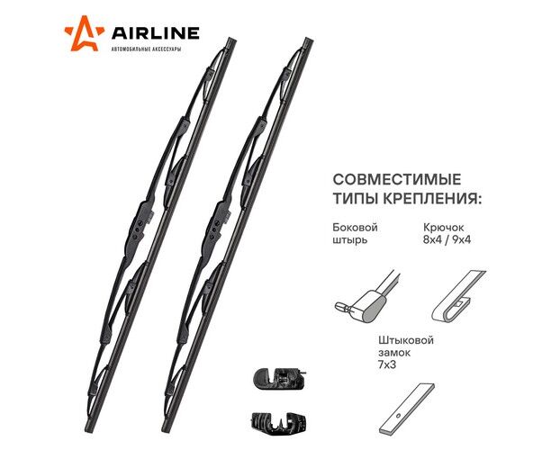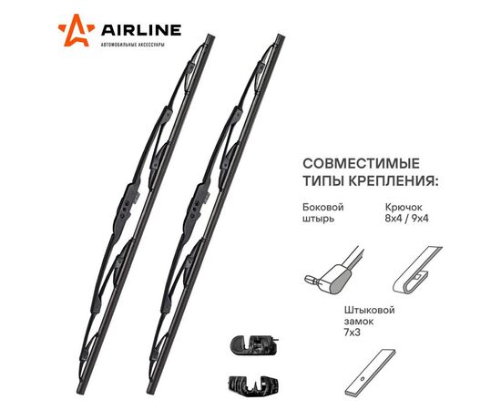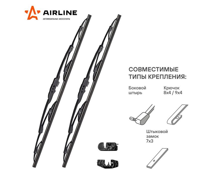 В комплект щеток стеклоочистителя входит два изделия с каркасной системой устройства и габаритными показателями 330 мм в длину. Щетки устанавливаются с помощью специальных адаптеров, которые подходят на большинство автомобилей. Гарантированное качество щеток обеспечивается за счет металлической конструкции и плотного резинового слоя на ленте устройства. Типы адаптеров и инструкцию по их установке Вы можете скачать здесь AWB-K-330K
