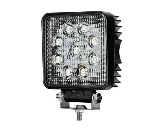 Светодиодная квадратная фара 27 Вт с 9 LED Epistar, размером около 11 см, предназначена для ближнего света и обладает следующими характеристиками:
