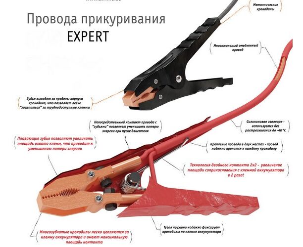 Провода прикуривания AIRLINE EXPERT разработаны инженерами нашей компании и предназначены для запуска двигателей легковых и грузовых автомобилей, а так же спецтранспорта с разряженной аккумуляторной батареей. Многожильный провод длинной 5м. позволяет использовать провода для любого коммерческого транспорта, а плавающие крокодилы с максимальной площадью контакта и технологией двойного контакта 2х2 позволят передать энергию с минимальными потерями.