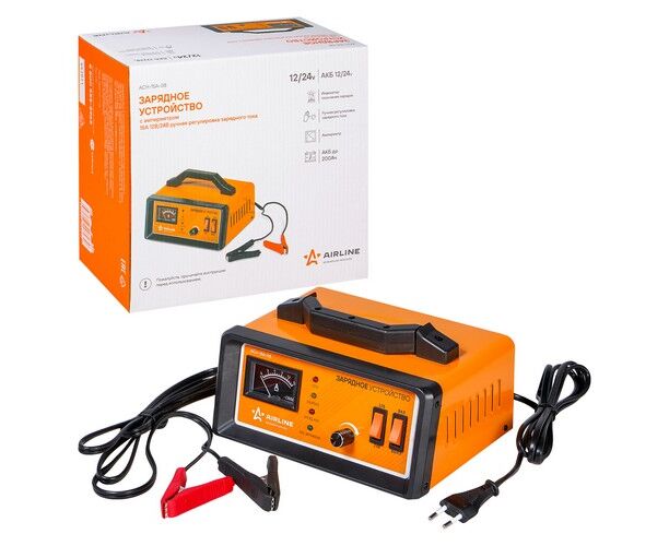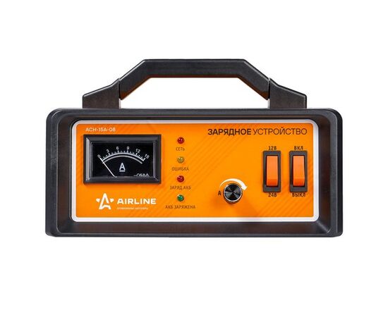 Назначение зарядных устройств AIRLINE - заряд автомобильных 12В свинцово-кислотных аккумуляторных батарей (далее АКБ) любого типа. Автоматические импульсные зарядные устройства надёжные, мощные и простые в управлении помощники автолюбителя. Модель ACH-15A-08 имеет автоматический режим зарядки с регулировкой зарядного тока до 15 ампер. ЗУ оснащено стрелочным амперметром для контроля зарядного тока и степени зарядки. Может использоваться для зарядки 12В и 24В АКБ. По мере зарядки ток снижается, не давая электролиту выкипать.