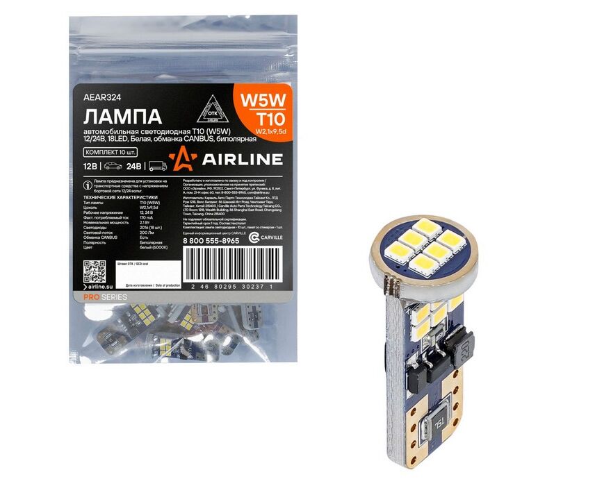 Лампа сигнальная светодиодная, обманка CANBUS, биполярная, 1 шт. W5W 5W 12/24V W2.1x9.5d 6000K AEAR3