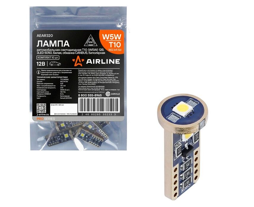 Лампа сигнальная светодиодная, обманка CANBUS, биполярная, 1 шт. W5W 5W 12V W2.1x9.5d 6000K AEAR320