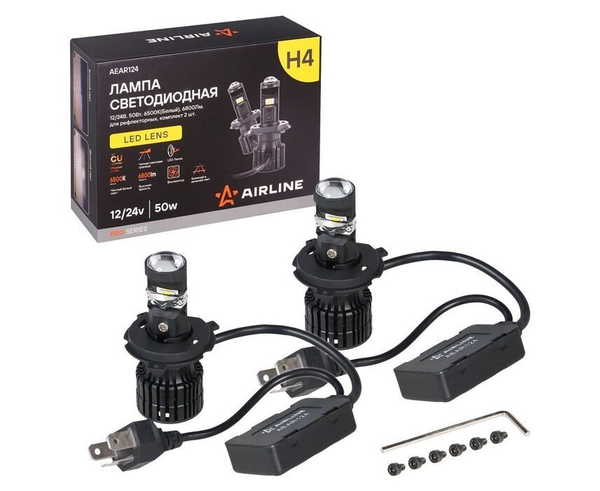 Лампа светодиод. H4, 12/24В, 50Вт, 6500К (Белый), 6800Лм, для рефлект. оптики, 2 шт., LED LENS (AEAR