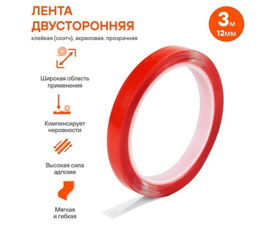 Лента двусторонняя клейкая (скотч), 12 мм*3 м, акриловая, прозрачная (ADS-A-05)