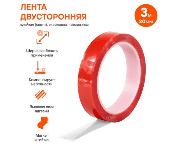 Лента двусторонняя клейкая (скотч), 20 мм*3 м, акриловая, прозрачная (ADS-A-06)