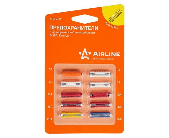 Набор автомобильных предохранителей изготовлен для отечественных автомобилей ВАЗ 2101-2107, а также некоторых моделей иностранных машин. Предохранители имеют цилиндрическую форму и номинальный ток, варьирующийся от 5А до 25А. Изделия представлены в блистерной прозрачной упаковке с нанесенным фирменным логотипом AIRLINE.