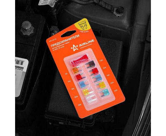 Производитель AIRLINE представляет набор компактных предохранителей категории «мини» в прозрачной блистерной упаковке. Номинальный ток изделий в зависимости от предохранителя составляет от 5А до 35А. Общее количество предохранителей в одной упаковке составляет 10 штук. Для установки предохранителей в электрическую цепь автомобиля необходимо следовать инструкции.
