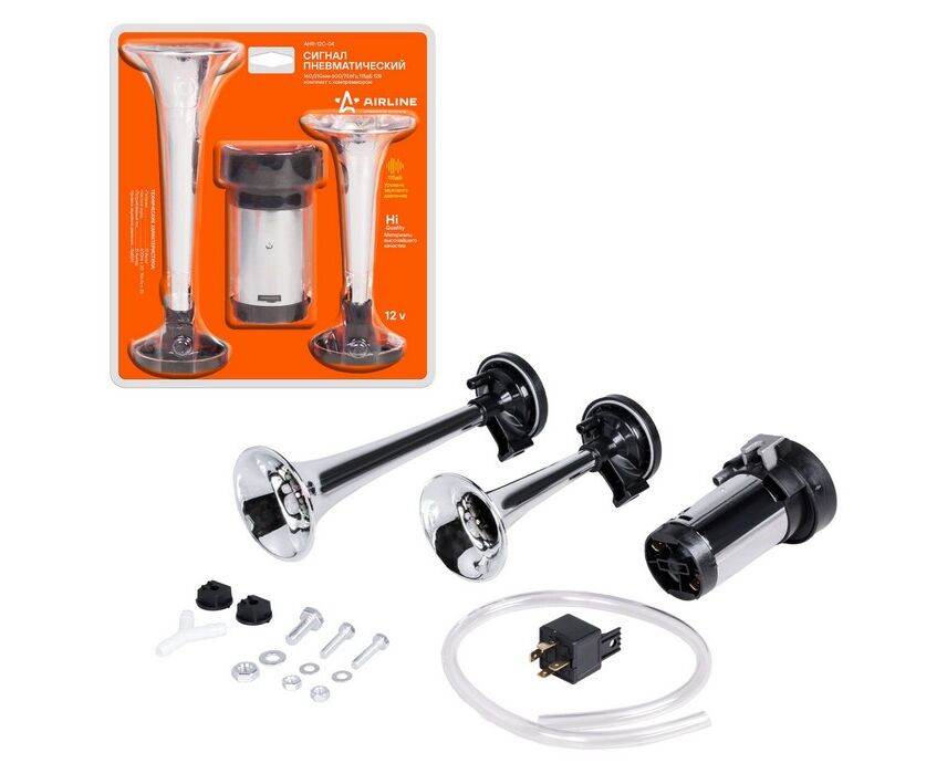 Звуковой сигнал станет оригинальным украшением автомобиля, а также дополнит его более мощным звуковым гудком на дороге. Данная модель изделия имеет пневматический механизм функционирования, а также компрессор, необходимый для работы. Модель изготовлена в сдержанных серо-черных тонах и имеет максимальный уровень громкости в 115дБ.