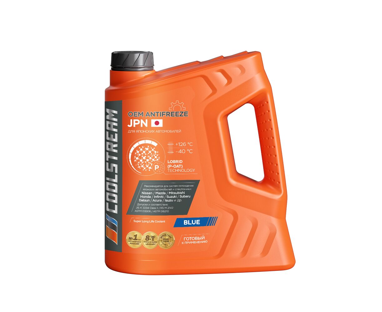 Coolstream JPN — фосфатный лобридный антифриз (P-OAT). Соответствует эксплуатационным требованиям стандартов JIS (Japanese Industrial Standards) K 2234 Class II, KS (Korean Standards) M 2142, ASTM D3306. Рекомендуется для систем охлаждения автомобилей с японскими двигателями (Nissan, Mazda, Mitsubishi, Honda, Infiniti, Suzuki, Subaru, Datsun, Acura, Isuzu и других в соответствии с рекомендациями производителей).