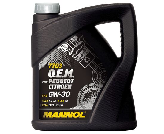 Mannol 7703 O.E.M. 5W-30 - синтетическое моторное масло нового поколения, специально разработанное для использования во всех бензиновых и дизельных двигателях автомобилей PEUGEOT и CITROEN. Современный пакет присадок (LOW SAPS) обеспечивает оптимальную работу систем защиты окружающей среды, а также фильтров твердых частиц (FAP, DPF). Эффективно защищает от износа и обеспечивает исключительную чистоту деталей двигателя. Рекомендовано для любых современных бензиновых и дизельных двигателей, в том числе отвечающих экологическим нормам EURO V. Создано с учетом требований для эксплуатации в тяжелых условиях и увеличенных интервалов замены моторного масла.